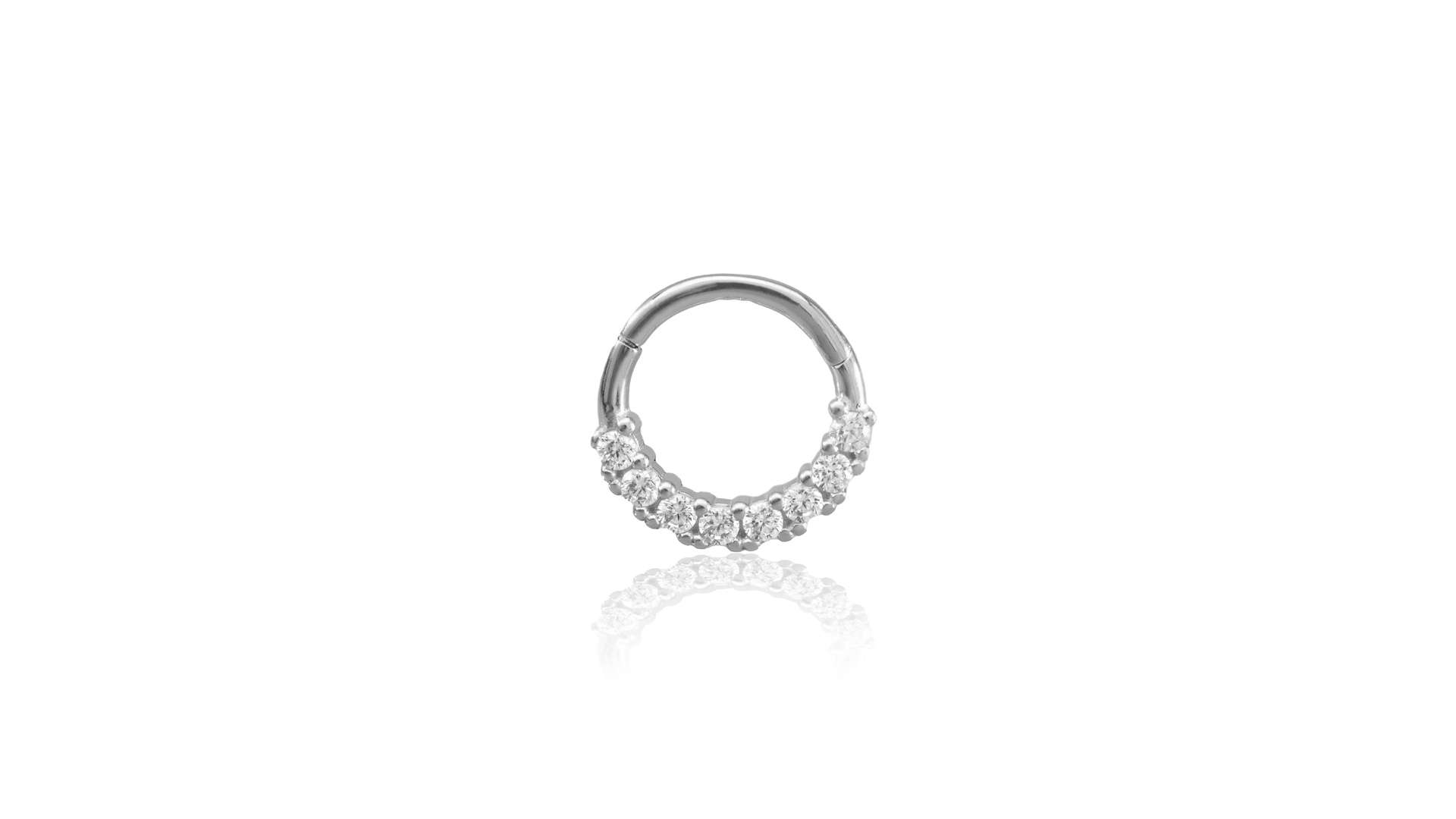 Ragyogó elegancia minden szögből! Ez a 14 karátos fehér aranyból készült karika piercing több finoman csillogó cirkónia kővel díszített, amelyek íves elrendezésben helyezkednek el, tökéletesen követve a karika formáját. Látványos, mégis kifinomult megjelenést nyújt – ideális daith/migrén piercinghez.