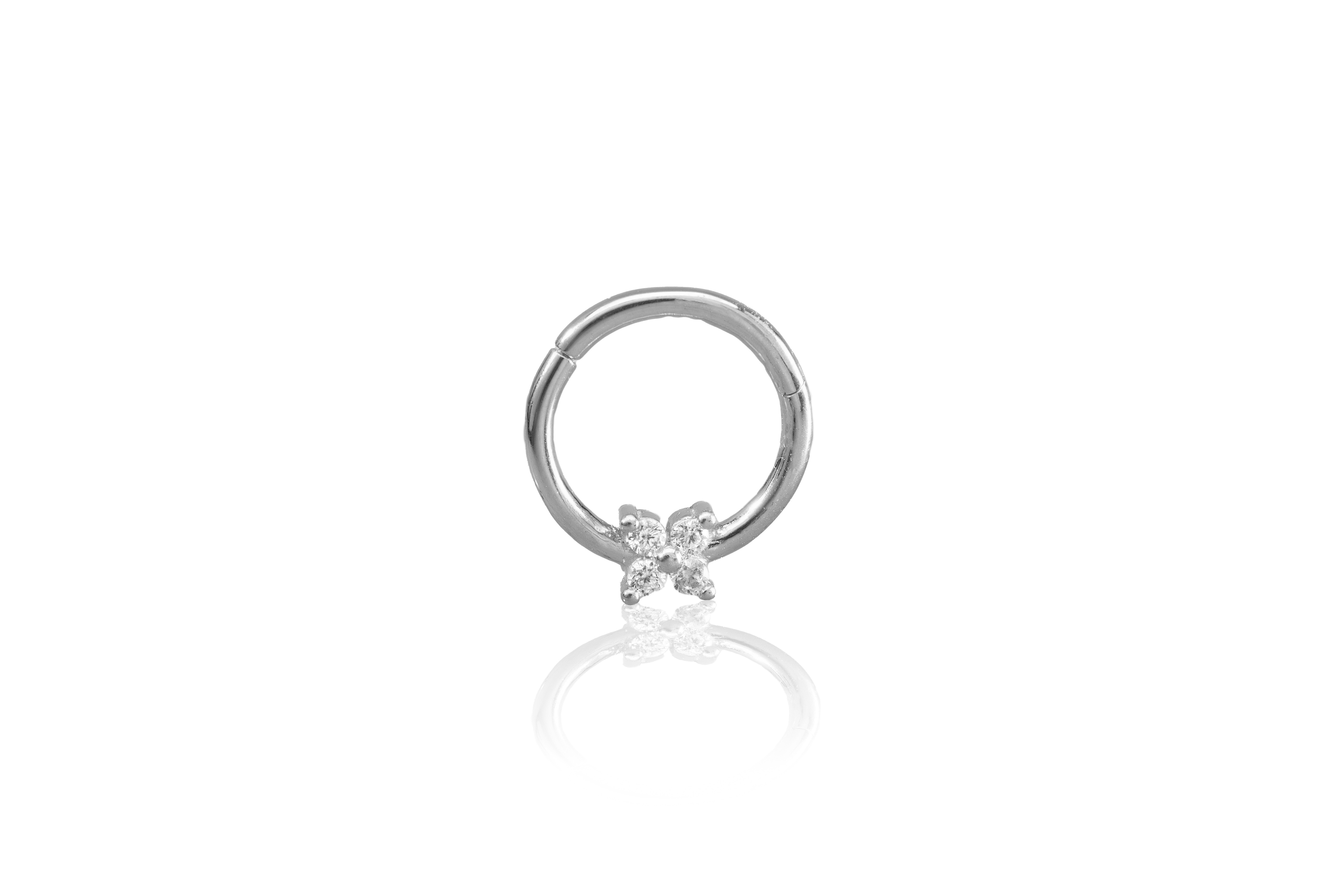 Ez az elegáns 14K fehér arany daith/migrén piercing apró, ragyogó cirkónia kövekkel díszített, amelyek tiszta, kifinomult csillogást adnak az ékszernek. A fehér arany letisztultsága és a kövek eleganciája harmonikus megjelenést biztosít, így az ékszer ideális választás mindennapi viselethez és különleges alkalmakhoz egyaránt.