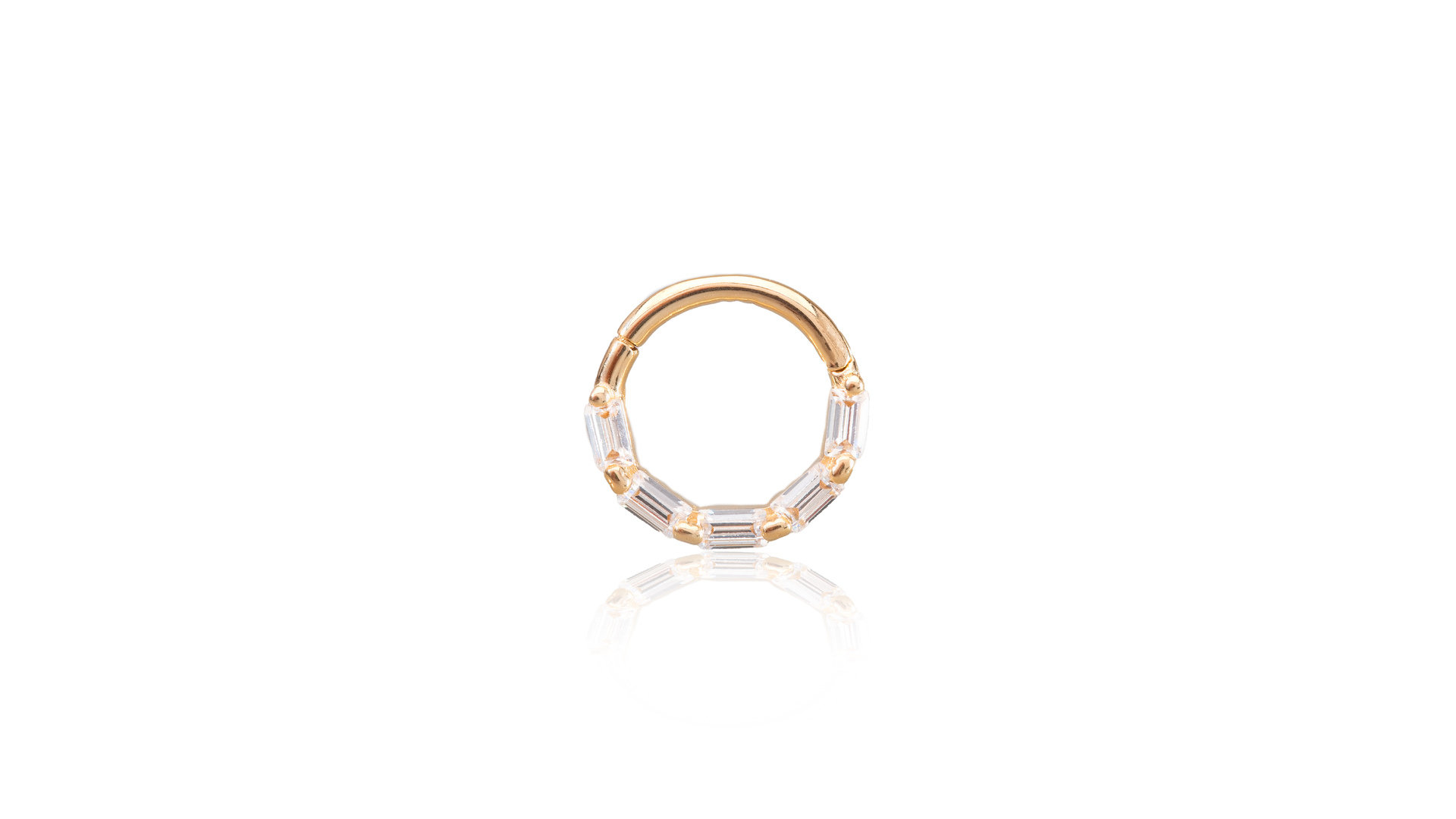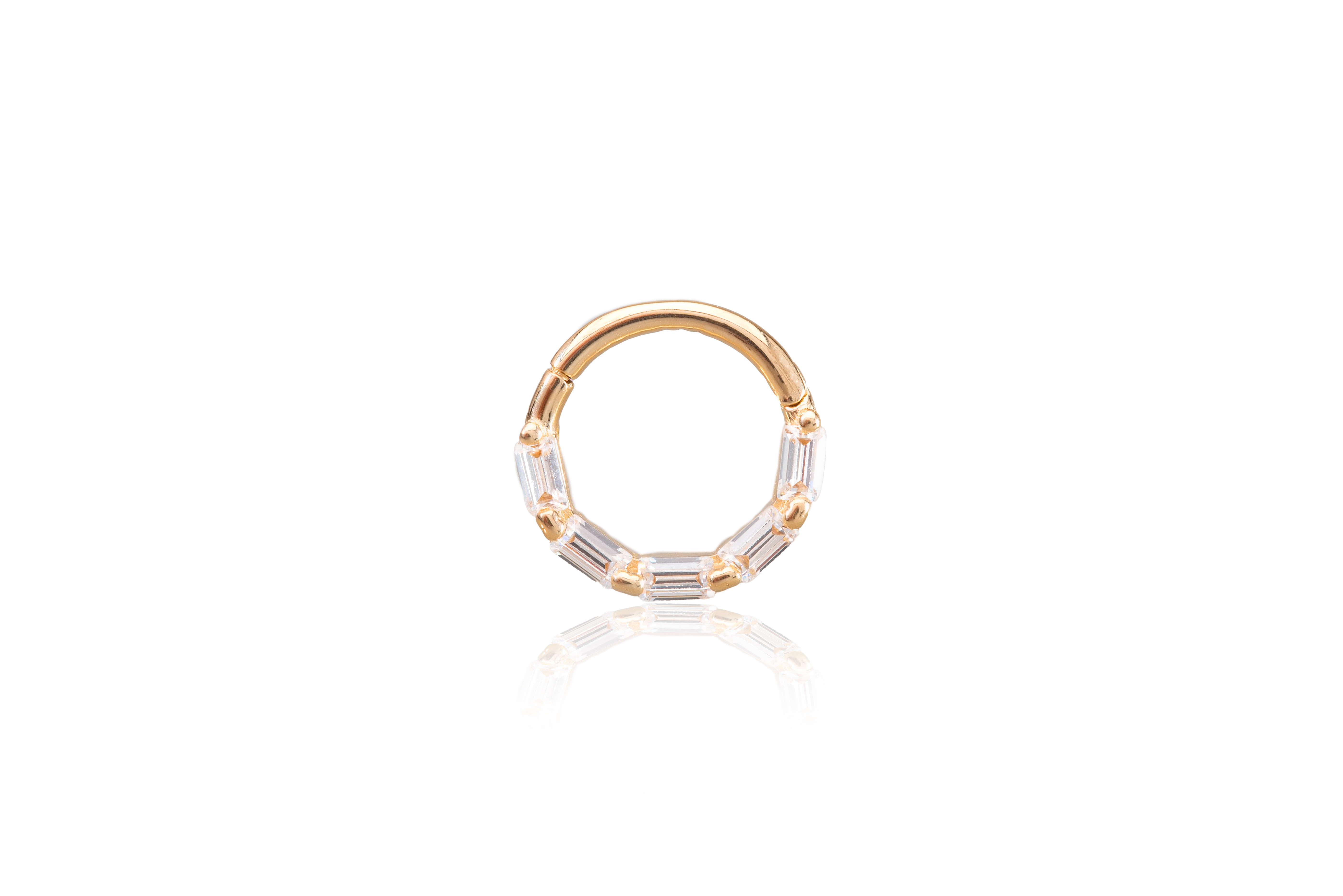 A 14 karátos sárga arany daith piercing cirkónia kövekkel díszítve egyszerre elegáns és kényelmes testékszer, amely tökéletes választás migrén piercingként, valamint más fülpiercingekhez is.