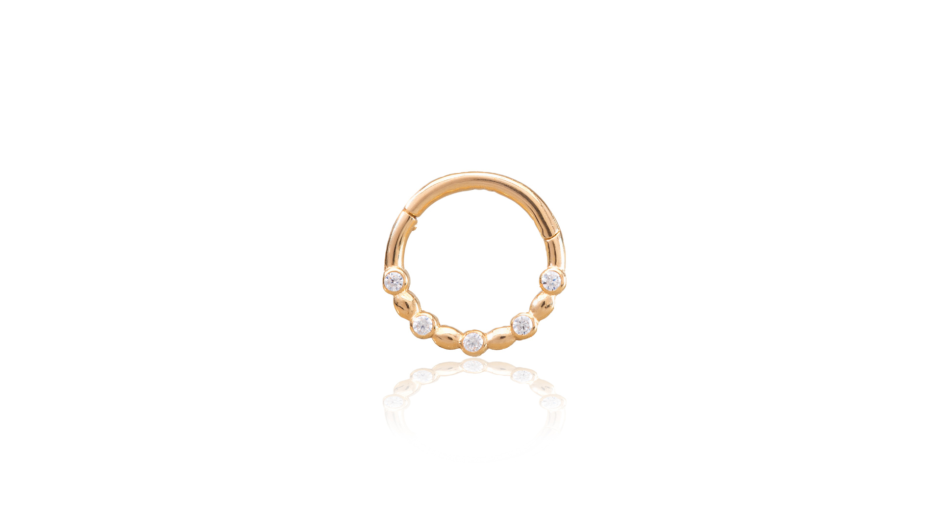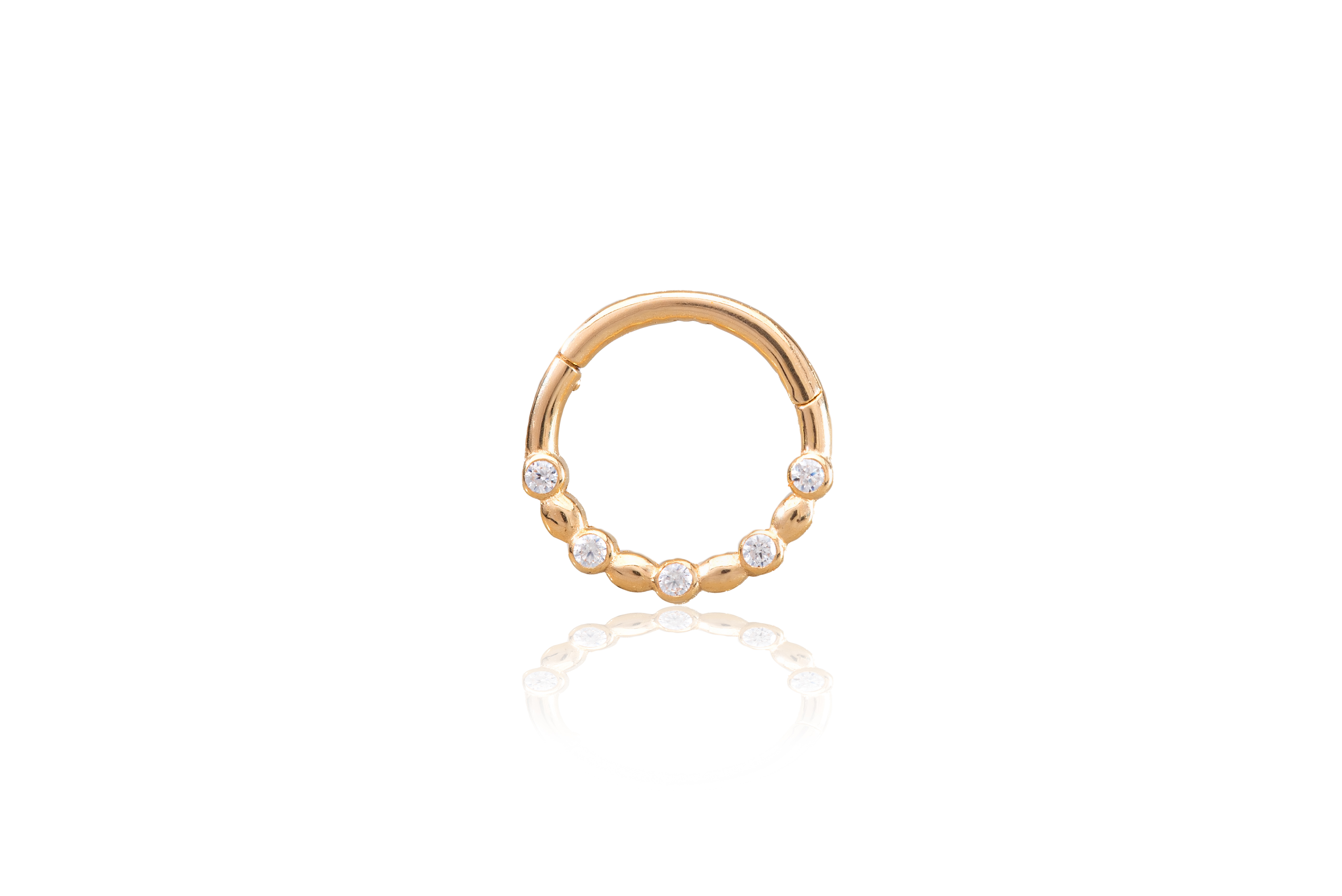 A 14 karátos sárga arany daith piercing cirkónia kövekkel díszítve különleges ragyogást és tartósságot kínál, így ideális választás mind a stílus, mind a kényelem kedvelőinek.