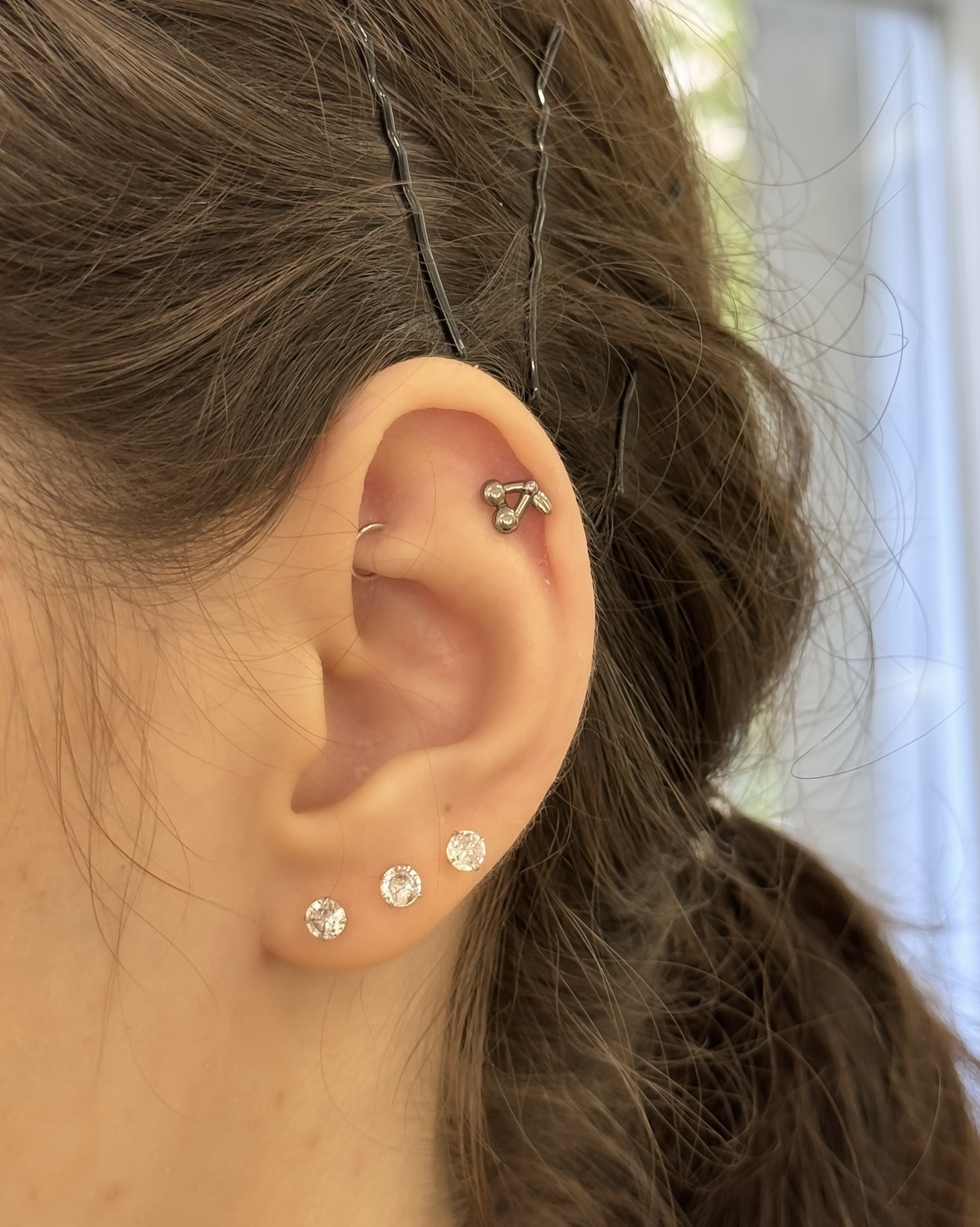 A piercing játékos, mégis elegáns választás a természet ihlette motívumok kedvelőinek. A cseresznye formájú díszítés finoman részletezett, mégis könnyed megjelenést kölcsönöz a fülön. Ez a stílus egyszerre bohókás és kifinomult – tökéletes kiegészítő egyedibb fülkompozíciókhoz is.
