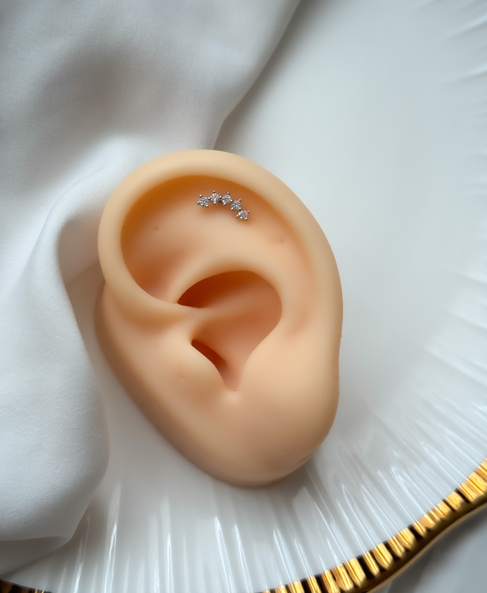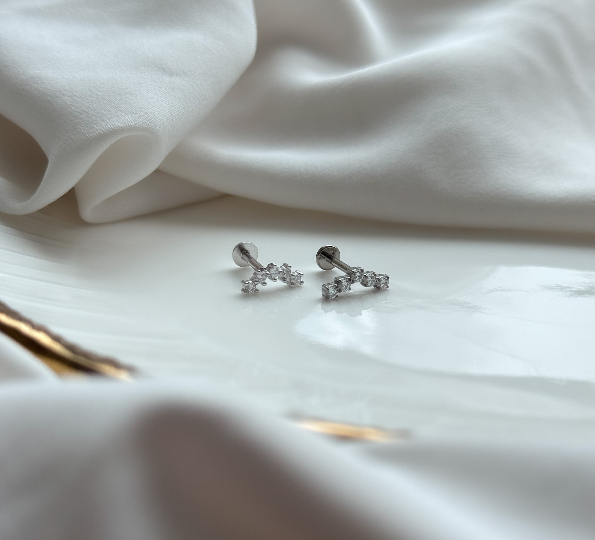 Ez a gyönyörűen formált, íves kialakítású fülpiercing fényesen csillogó fehér cirkónia kövekkel és S925 sterling ezüstből készült szárával tökéletes választás azoknak, akik finoman ívelt, nőies ékszert keresnek a fülükbe. Az ékszer könnyedén követi a fül vonalát, különösen jól mutat helix, flat vagy conch piercingként.
