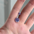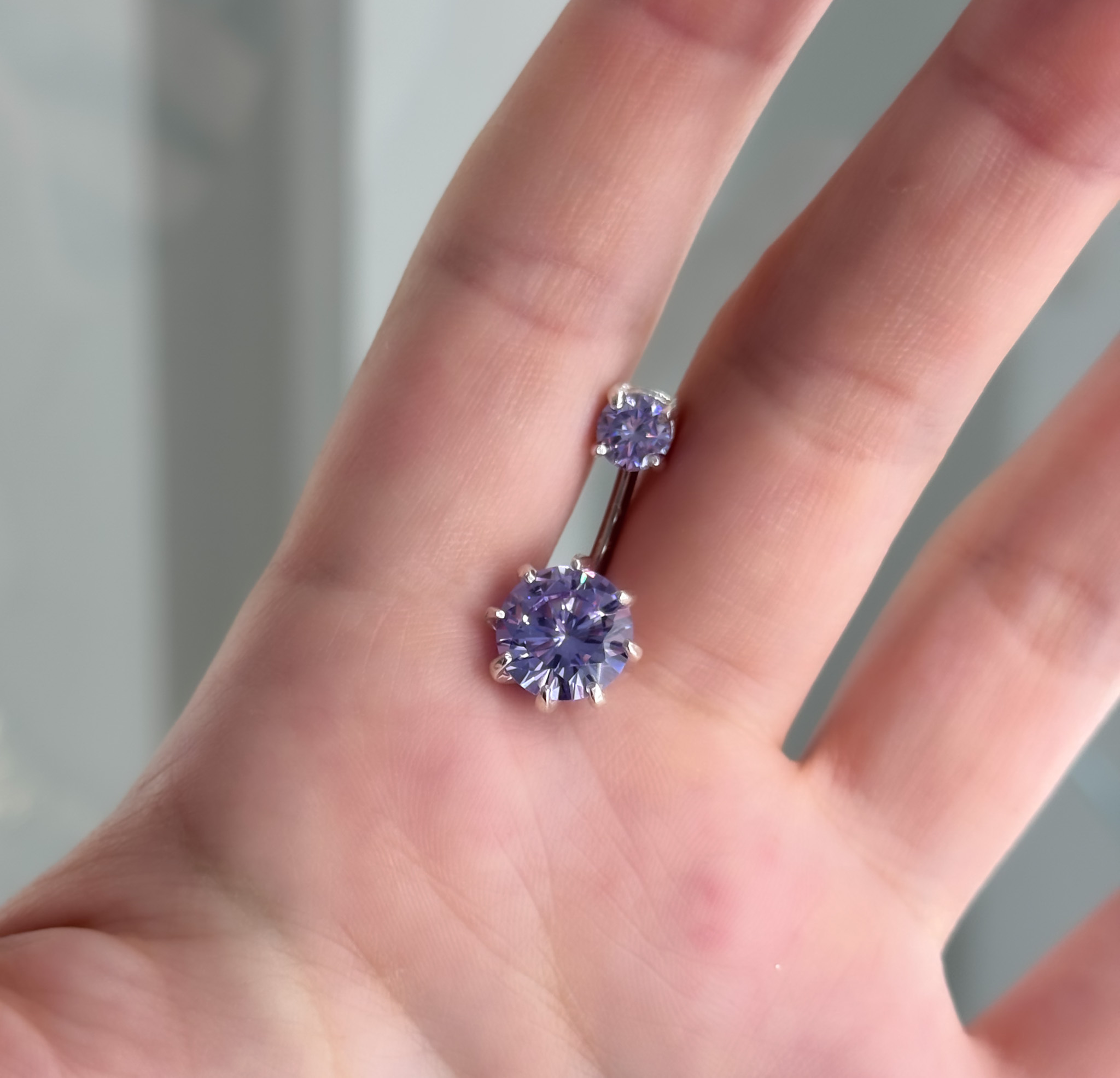 Elegáns lila cirkónia köves köldökpiercing orvosi acél szárral és S925 ezüst foglalattal. A 4x4 mm-es felső kő és a 9x9 mm-es alsó lila cirkónia kő gyönyörű, feltűnő ragyogást biztosít. 10 mm szárhossz és 1,6 mm szárvastagság mellett a kialakítás kényelmes és biztonságos viseletet nyújt. Hipoallergén anyaghasználata miatt érzékeny bőrűek számára is ideális választás, alkalmi és mindennapi használatra egyaránt.
