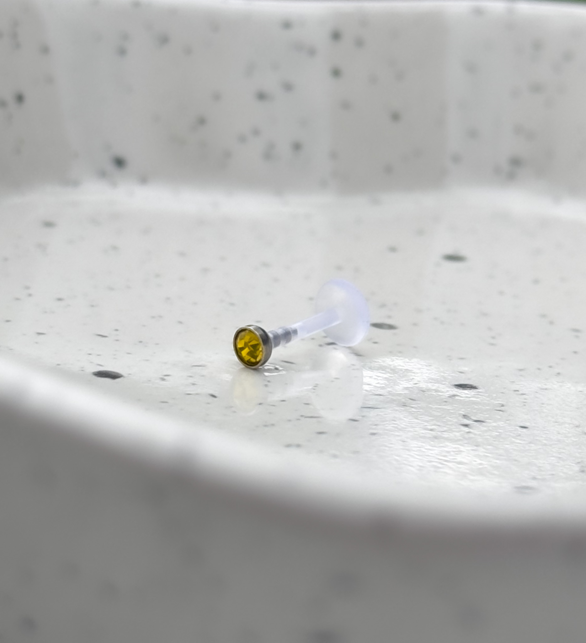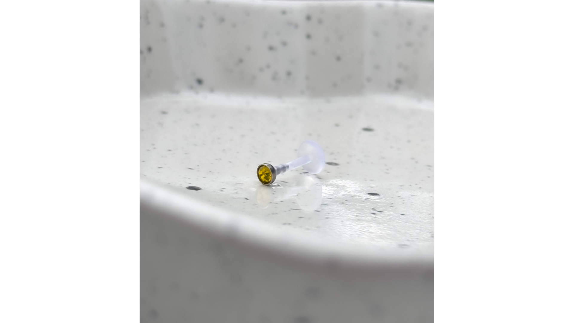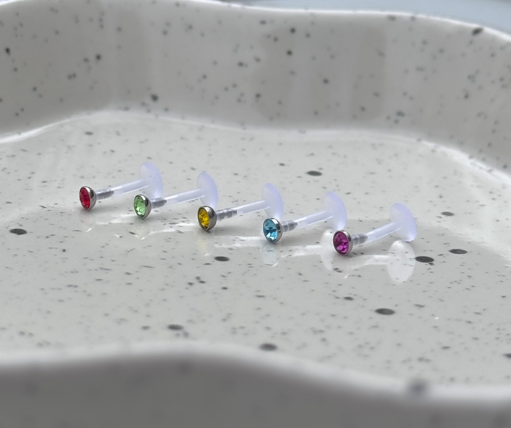 Ez a műanyag talpas piercing ideális választás azoknak, akik érzékeny füllel rendelkeznek, vagy olyan helyzetben vannak, amikor fém ékszer viselése nem ajánlott. Az áttetsző, rugalmas műanyag szár hossza 8 mm, amely kényelmes viseletet biztosít, még hosszabb időn át is. A piercing látványos, színes kő díszítést kapott, amelyet fém foglalat emel ki és tesz elegánsan ragyogóvá.