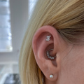 Ez az ezüst színű titán fülpiercing három ragyogó cirkónia kővel igazán különleges választás a flat, conch vagy fülcimpa (lobe) piercingek kedvelőinek. A különböző formájú kövek (egy kerek és két csepp alakú) elegáns, mégis egyedi elrendezésben helyezkednek el, így a piercing diszkrét, de látványos ékszerként emeli ki a fülformát.